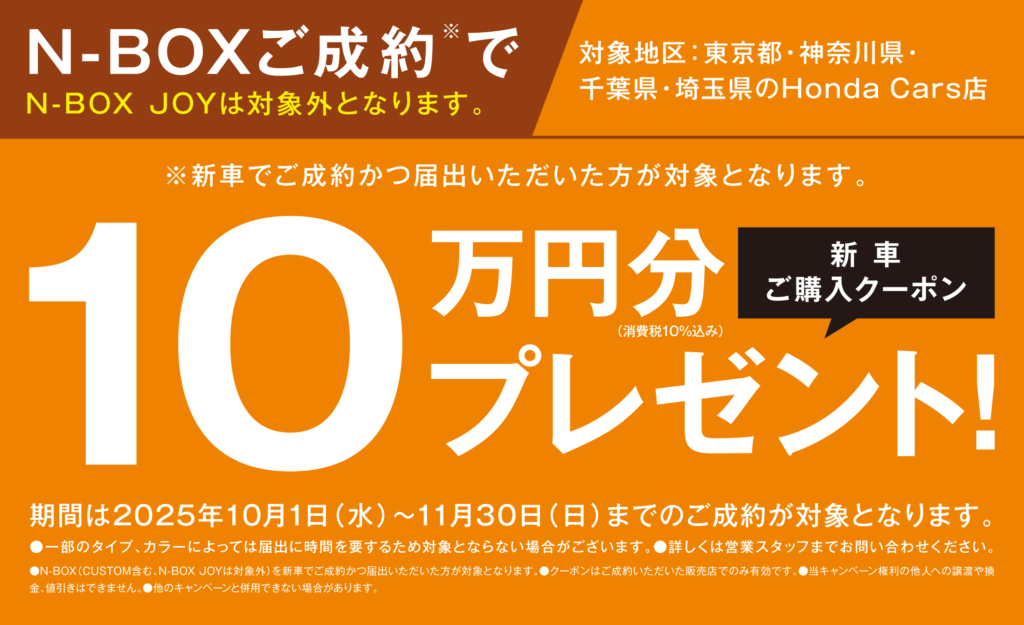 TOP > キャンペーン > N-BOXご成約で新車ご購入クーポン10万円分プレゼント!