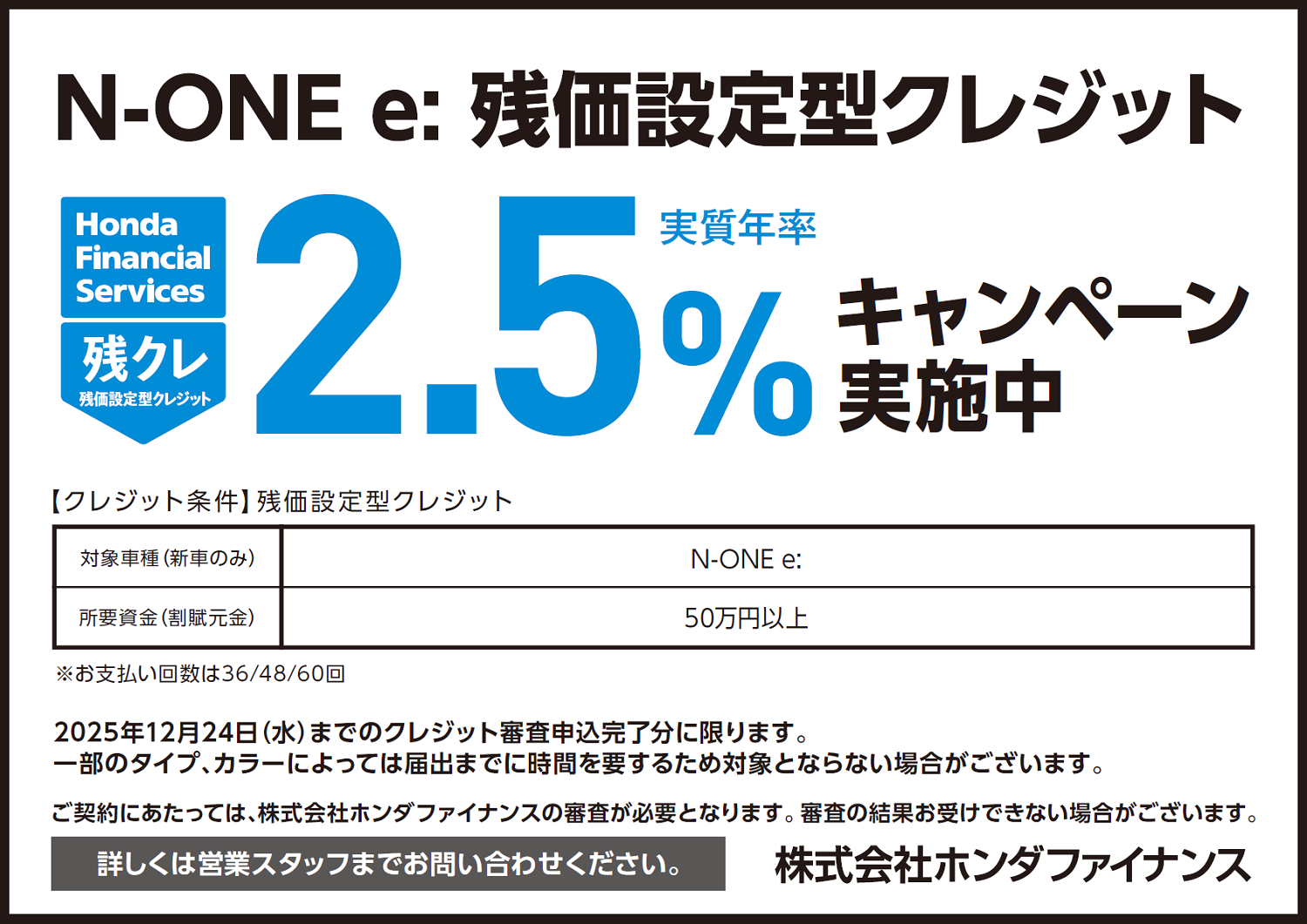 キャンペーン TOP > キャンペーン > N-ONE e: 残クレ2.5%キャンペーン実施中! 2025/09/11 N-ONE e: 残クレ2.5%キャンペーン実施中! ZR-V 残クレ2.5%キャンペーン実施中! この機会にぜひご検討ください★★
