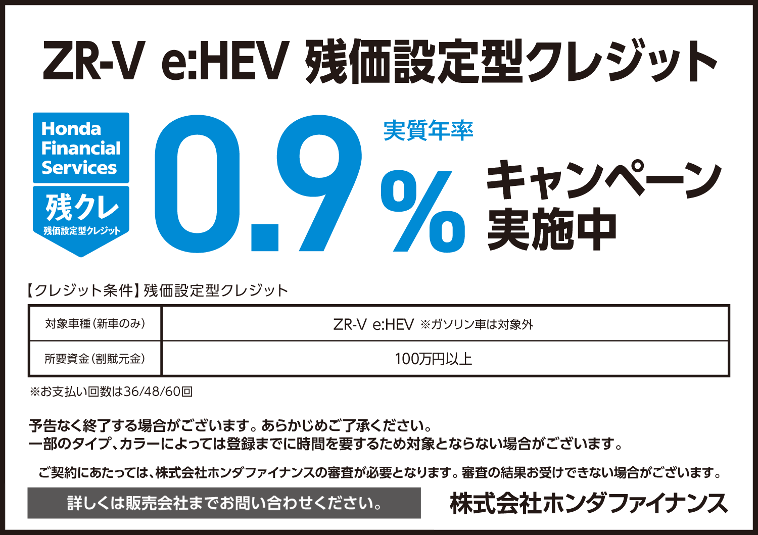 キャンペーン TOP > キャンペーン > ZR-V e:HEV 残クレ0.9%キャンペーン実施中! 2026/03/26 ZR-V e:HEV 残クレ0.9%キャンペーン実施中! ZR-V e:HEV 残クレ0.9%キャンペーン実施中! この機会にぜひご検討ください★★
