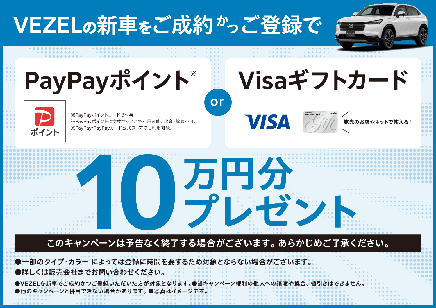 VEZELの新車をご成約かつご登録でPayPayポイント or Visaギフトカード10万円分プレゼント!