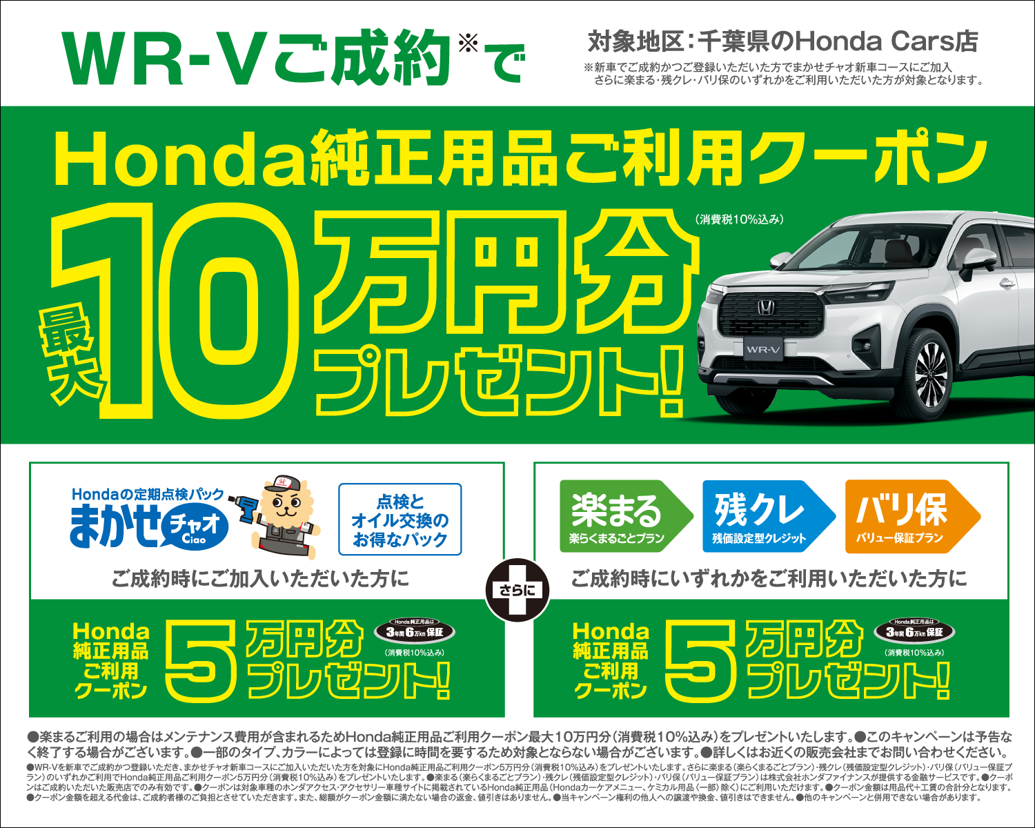TOP > キャンペーン > WR-Vご成約でHonda純正用品ご利用クーポン最大10万円分プレゼント!