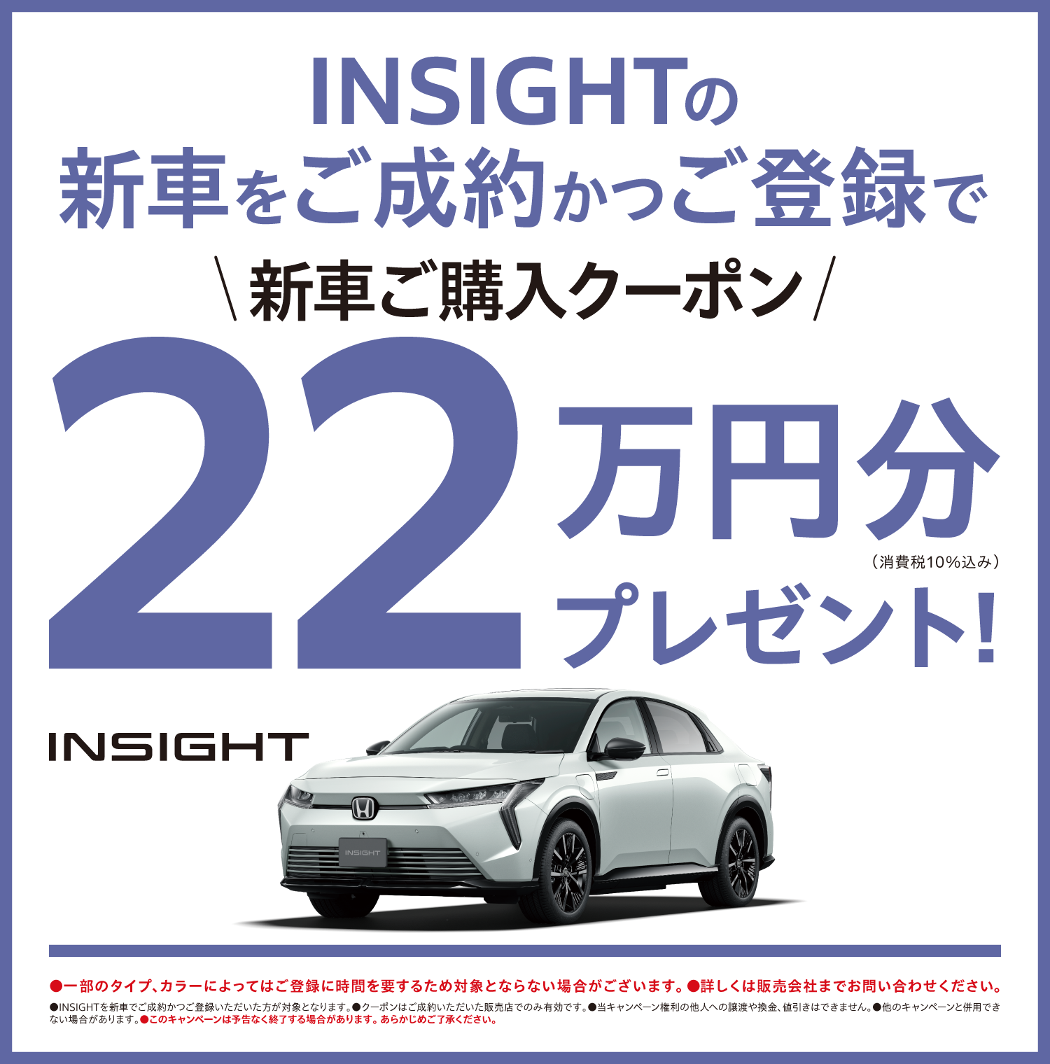 TOP > キャンペーン > INSIGHTの新車をご成約かつご登録で新車ご購入クーポン22万円分プレゼント!
