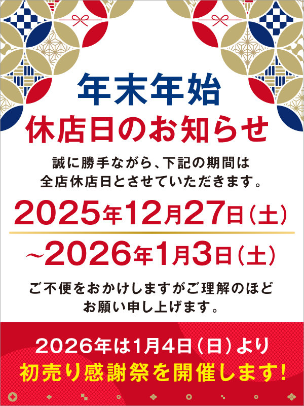 年末年始休店日のお知らせ