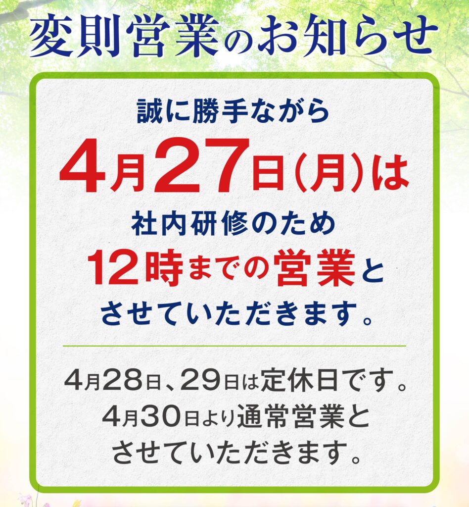 さて、誠に勝手ながら、4月27日(月)は変則営業とさせていただきます。